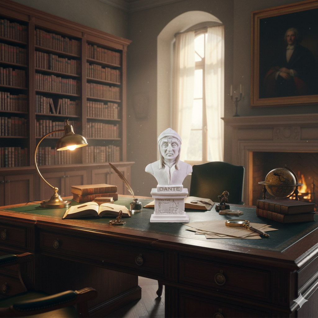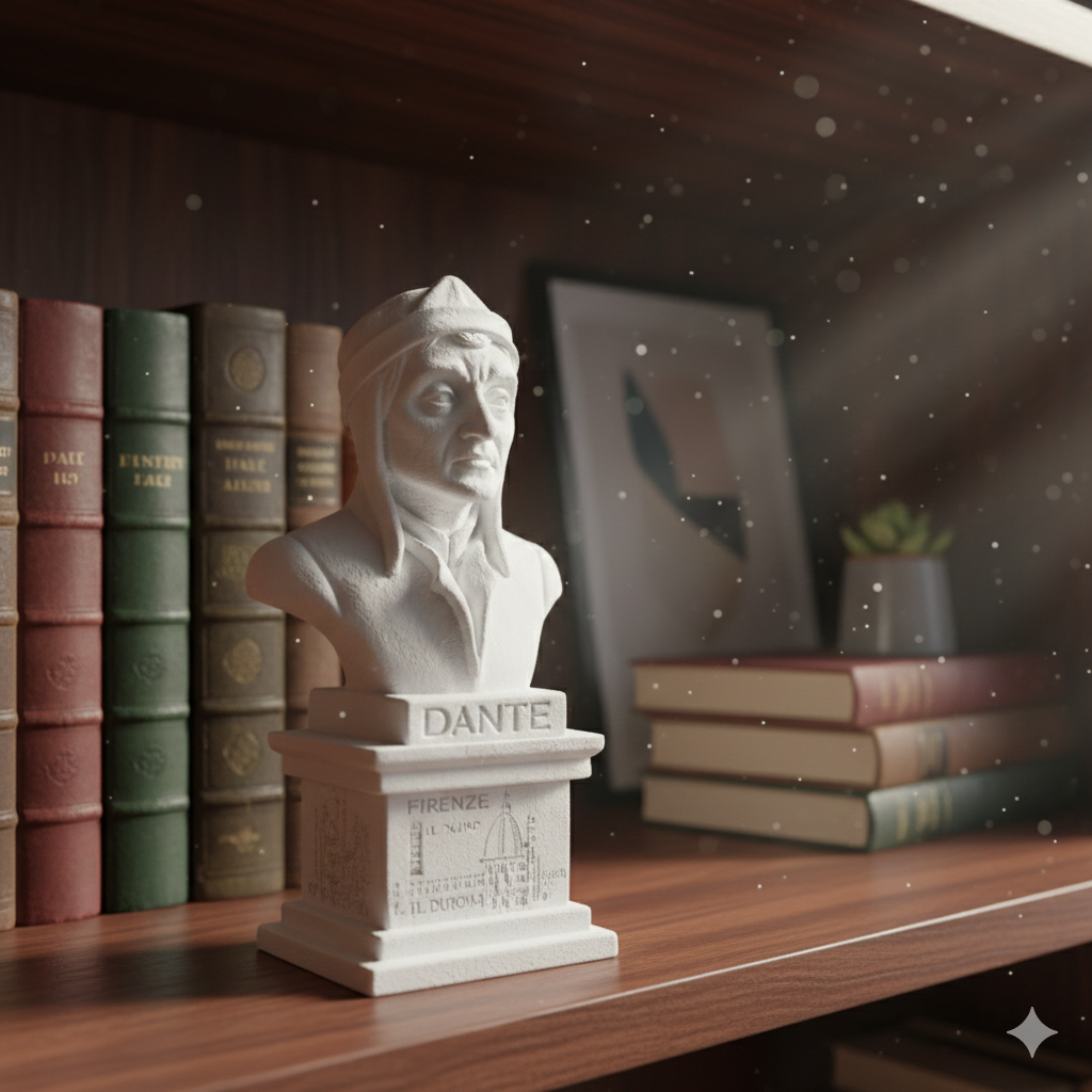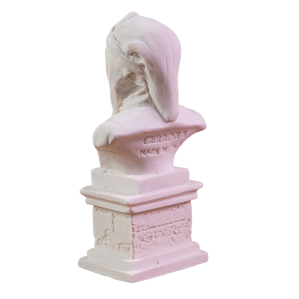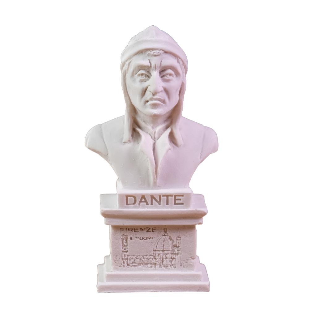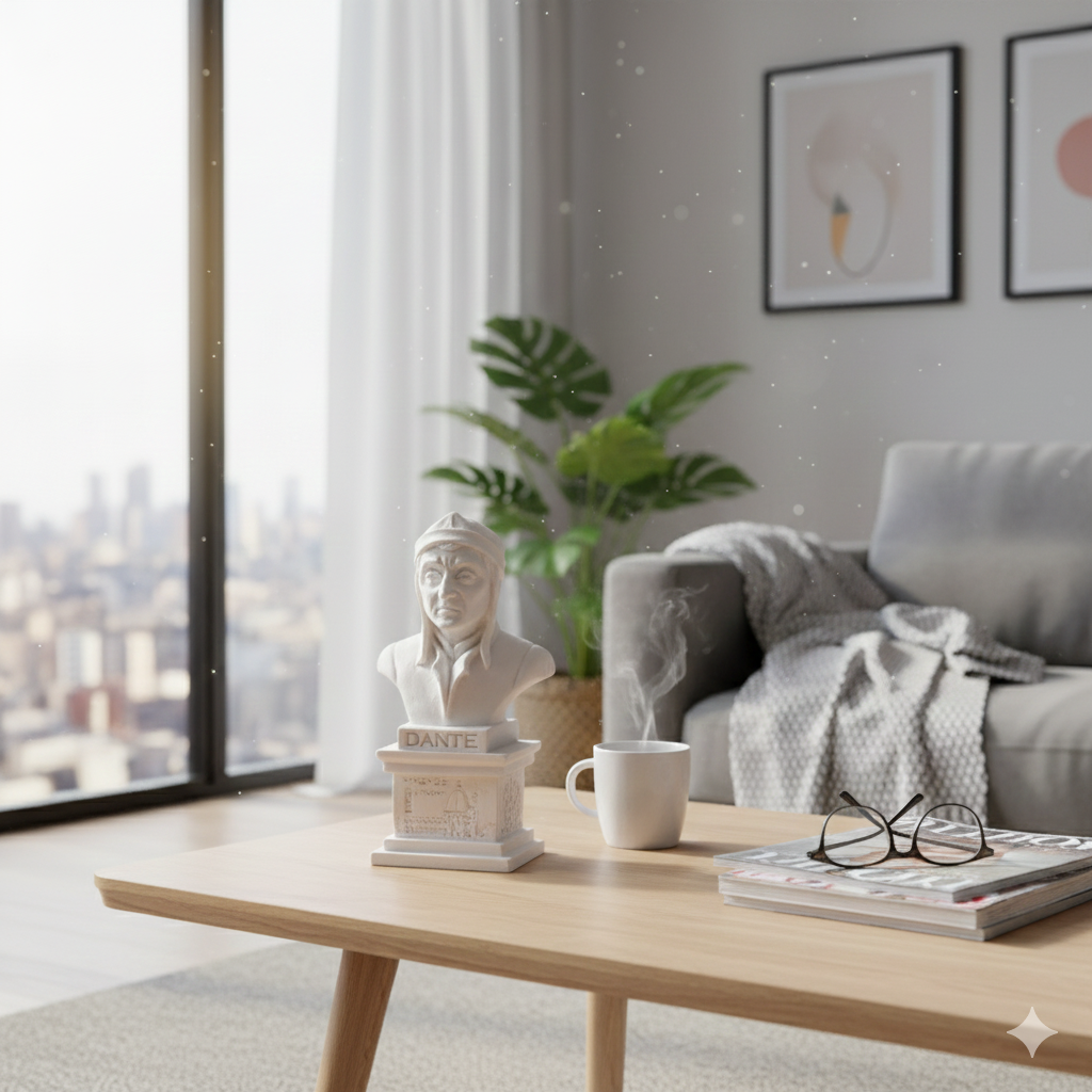 Bu ürün, ünlü İtalyan şair Dante Alighieri’yi betimleyen dekoratif bir büst heykelidir. İlahi Komedya’nın yazarı olarak dünya edebiyatında büyük bir yere sahip olan Dante’nin karakteristik yüz ifadesi, başlığı ve dönemin kıyafet detayları heykelde sade ama etkileyici bir şekilde yansıtılmıştır. Kaidesinde “DANTE” yazısı ve Floransa mimarisini temsil eden kabartmalar bulunur. Antik mermer tonundaki görünümü sayesinde klasik sanat estetiğini mekâna taşır.