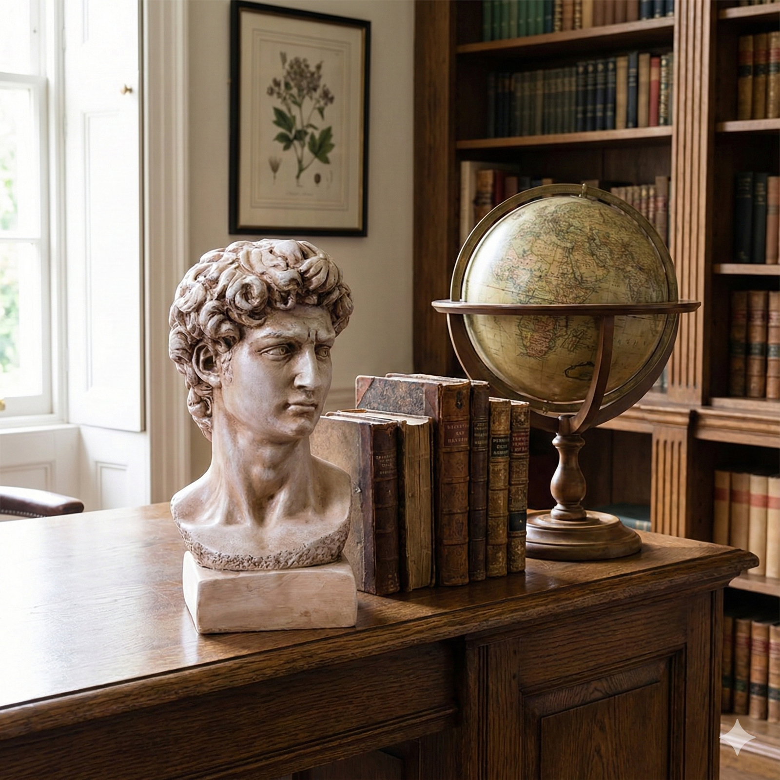 Kütüphane, çalışma masası ve kitaplık üzerinde estetik bir büst olarak sergilenebilir