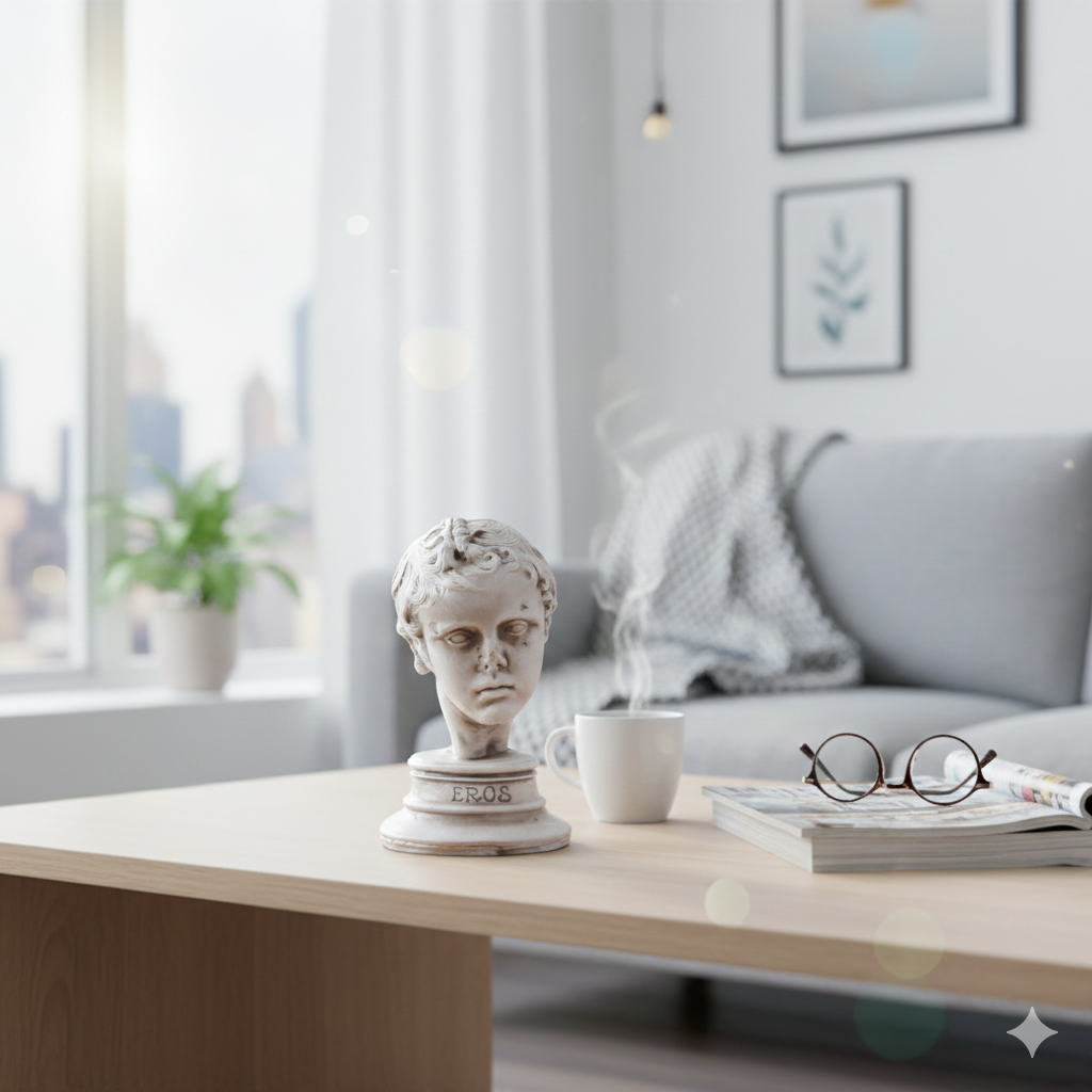 Bu ürün, Antik Yunan mitolojisinde aşkın ve çekimin tanrısı olarak bilinen Eros’un çocuk figürünü tasvir eden dekoratif bir büst heykelidir. Hafif hüzünlü yüz ifadesi, detaylı saç kıvrımları ve antik mermer dokulu yüzeyi sayesinde klasik dönem estetiğini taşıyan zarif bir obje niteliğindedir. Kaidesinde “EROS” yazısı bulunur ve bu detay heykelin mitolojik kimliğini vurgular. Sanat ve mitoloji temalı koleksiyonlar için anlamlı bir parçadır.