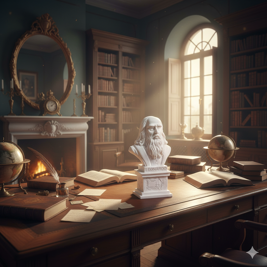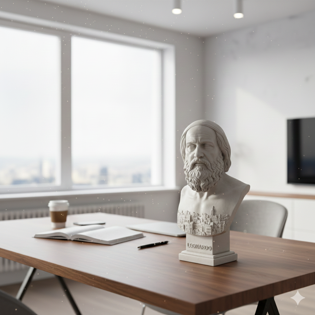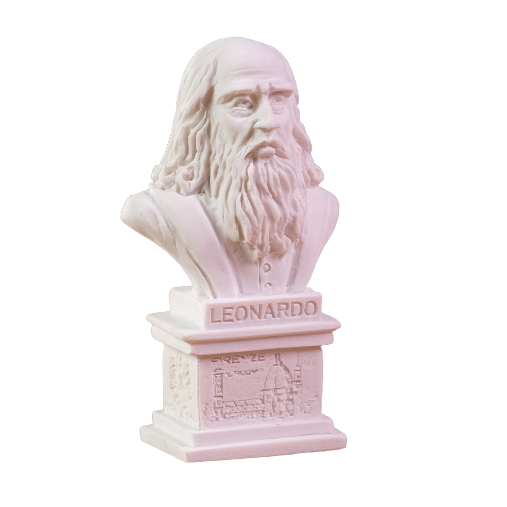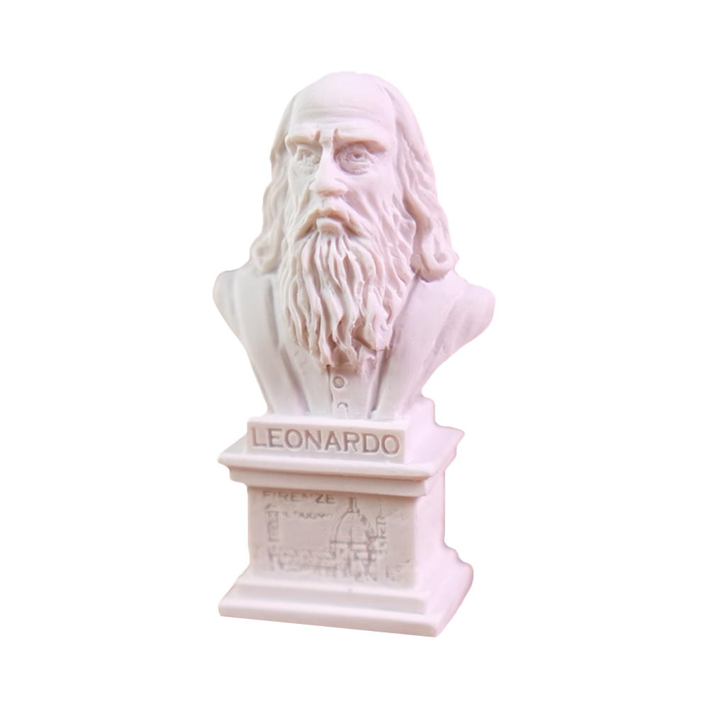 Bu ürün, Rönesans’ın dâhisi Leonardo da Vinci’yi tasvir eden dekoratif bir büst heykelidir. Uzun sakalı, derin bakışları ve dönem kıyafet detayları, Leonardo’nun bilge ve araştırmacı karakterini yansıtan klasik bir sanat formunda işlenmiştir. Kaidesinin üzerinde “LEONARDO” ismi ve Floransa mimarisinden esinlenen kabartmalar yer alır. Antik mermer tonundaki görünümü ile sanat, bilim ve tarih temalı dekorasyonlarda öne çıkan özel bir parçadır.