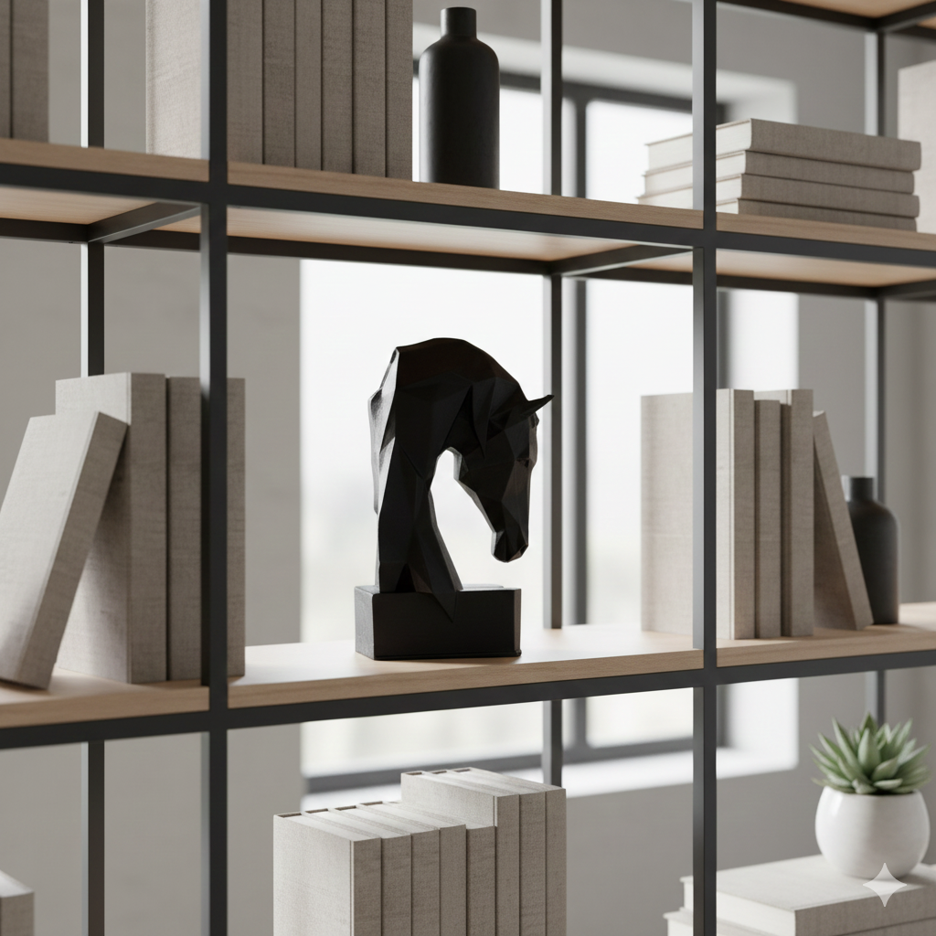 Bu ürün, modern tasarım çizgileriyle oluşturulmuş “at figürlü kitap ayracı / kitap tutucu” setidir. Geometrik hatlarla modellenmiş siyah at başları, hem minimal hem de şık bir dekor anlayışını yansıtır. Kitapların devrilmesini engelleyen sağlam yapısı sayesinde hem işlevsel hem de estetik bir kullanım sunar. Ev ve ofis kitaplıklarında modern, zarif ve güçlü bir duruş sergileyen dekoratif bir settir.